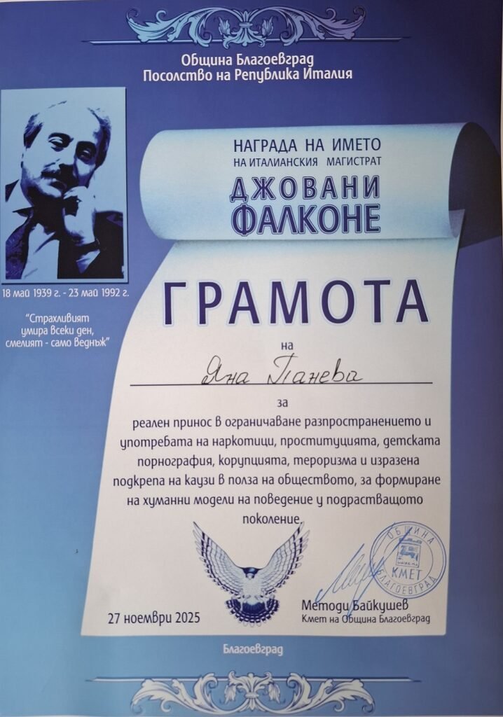 Съдия Яна Панева от Наказателно отделение на Окръжен съд – Варна беше отличена с грамота на името на Джовани Фалконе в национален конкурс за магистрати и служители на МВР, организиран от Община Благоевград и Посолството на Италия в България.