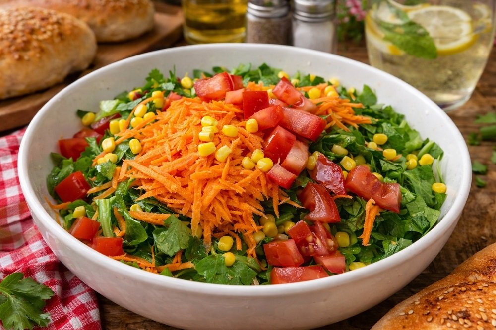 В голяма купа накъсайте марулята и руколата. Добавете настъргания морков, домата и царевицата.