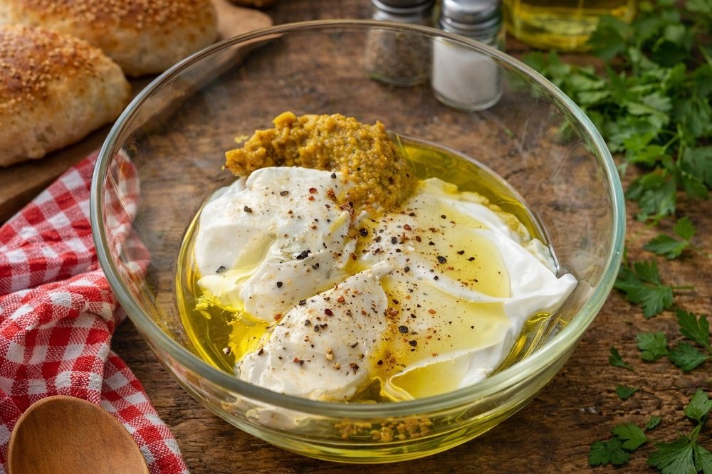 В малка купа смесете киселото мляко, майонезата, лимоновия сок, горчицата, зехтина, солта и черния пипер до гладък крем.