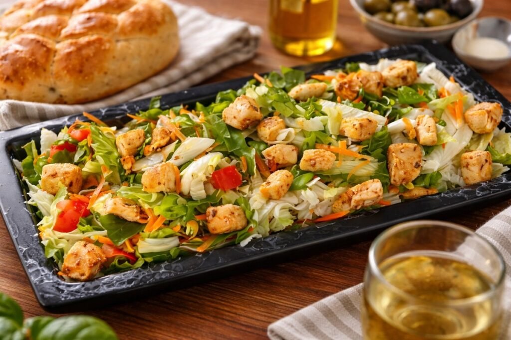 Свежи зеленчуци, крехко пилешко месо и нежен йогурт дресинг се събират в салата, която засища и освежава едновременно. Хрупкавата маруля, леко горчивата рукола, сладостта на моркова и сочните пилешки хапки се допълват от кремообразния сос, който обединява вкусовете във всяка хапка.