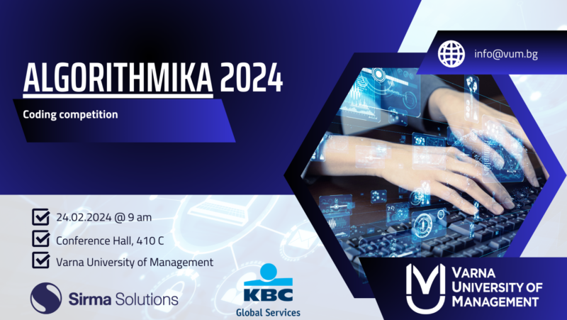 Висше училище по мениджмънт-Варна кани всички желаещи да се запишат за участие в предстоящото състезание „Алгоритмика“, което ще се проведе на 24.02.2024 г. в Конферентна зала (410С) на Висше училище по мениджмънт (гр. Варна, ул. „Оборище“ 13А, ет. 4).