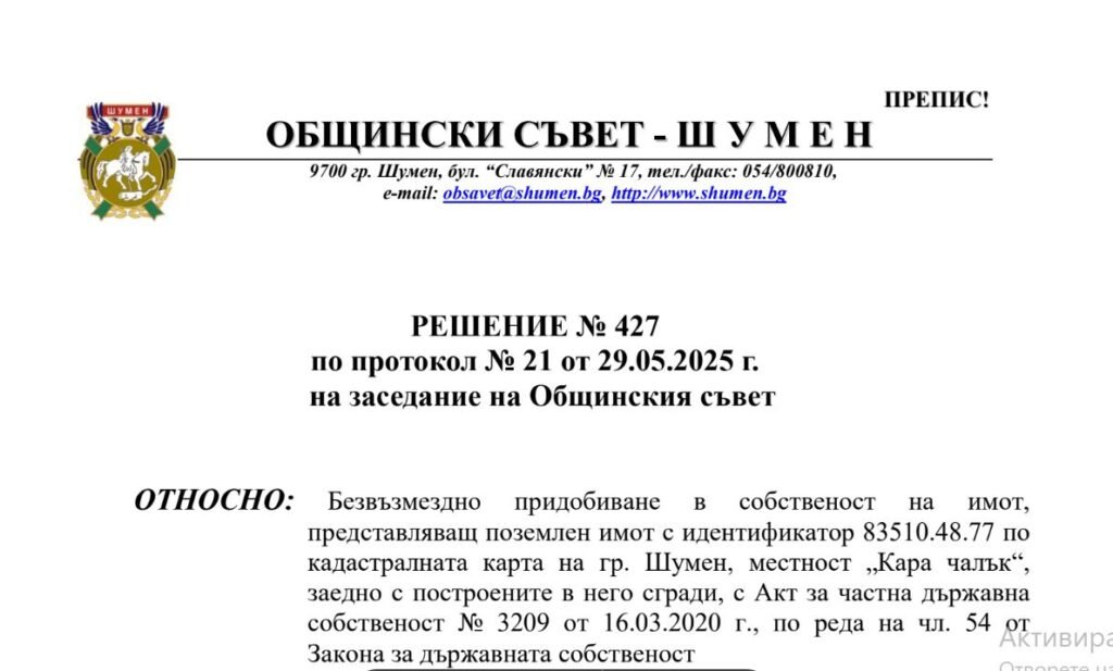 ОТНОСНО: Безвъзмездно придобиване в собственост на имот, представляващ поземлен имот с идентификатор 83510.48.77 по кадастралната карта на гр. Шумен, местност „Кара чалък“, заедно с построените в него сгради, с Акт за частна държавна собственост No 3209 от 16.03.2020 г., по реда на чл. 54 от Закона за държавната собственост