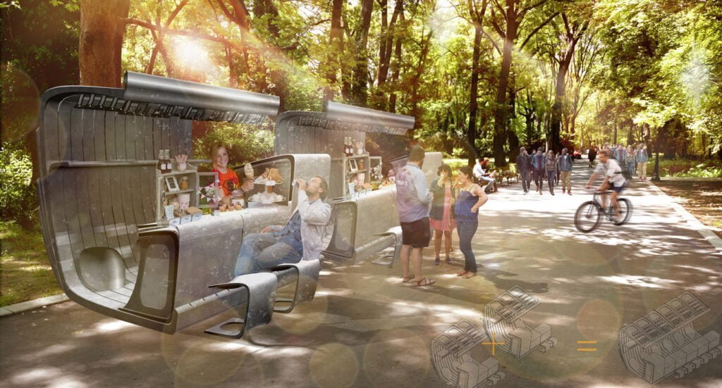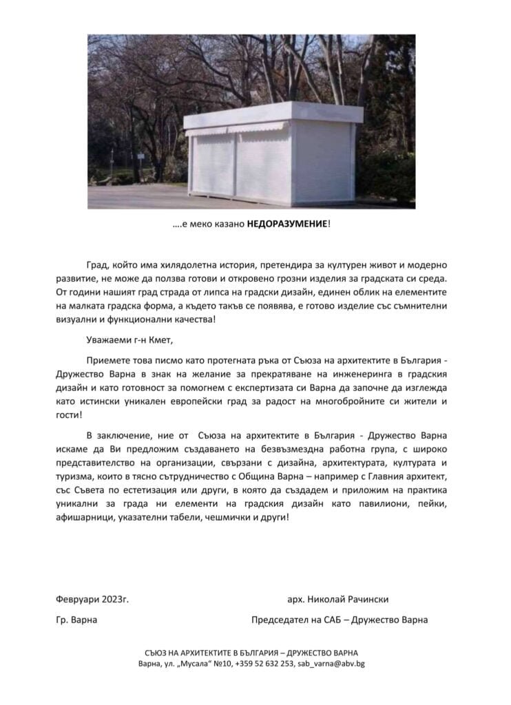 “Смятаме, че това е едно голямо недоразумение и призоваваме за незабавното им премахване. След като имаме проведен международен конкурс през 2016 г. за идеен проект на малък търговски павилион за гр. Варна, с многобройни участници, с прекрасни представени проекти и победител, чийто проект изглежда по този начин”, коментират от дружеството на архитектите и споделят снимки:
