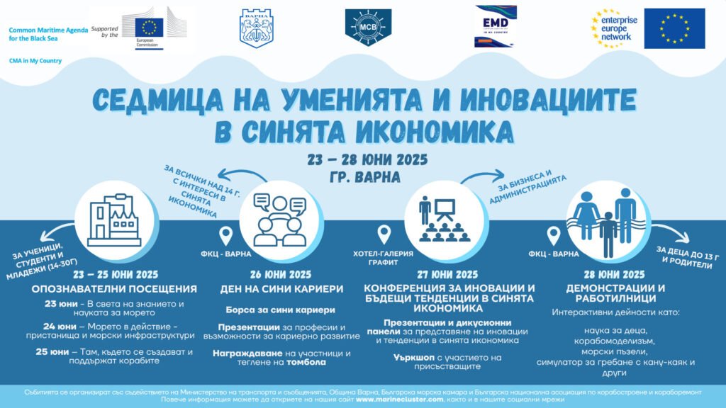 „Седмица на умения и иновации в синята икономика“ ще се проведе във Варна от 23 до 28 юни 2025 г. Организатор на събитието е Морски клъстър България, със съдействието и подкрепата на Община Варна, Българска национална асоциация по корабостроене и кораборемонт, Българска морска камара, BSAM и Enterprise Europe Network. Събитието е насочено към популяризиране на професиите, иновациите и устойчивото развитие в секторите на синята икономика, а всички събития в нея са част от инициативата „Европейски морски ден в моята страна 2025“.