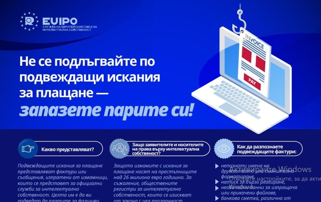 Подвеждащите фактури представляват фалшиви писма или имейли, изпращани от измамници, които се представят за официални ведомства. Те често използват логотипи, спешен език, фалшиви връзки или QR кодове, за да подмамят заявителите и притежателите на права да платят за несъществуващи или ненужни услуги.