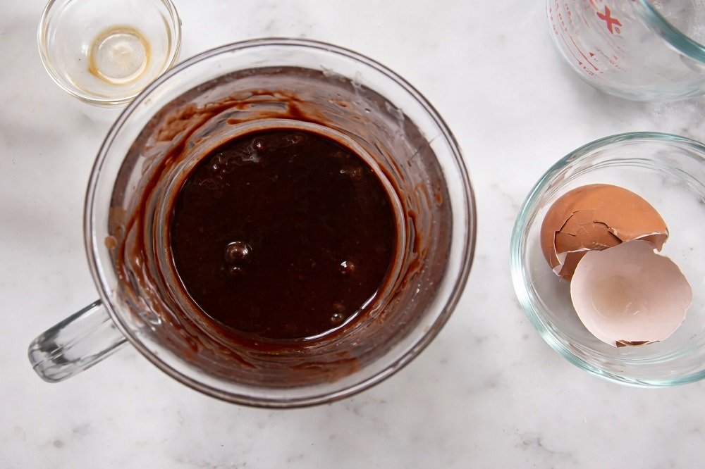 - Добави сухите съставки, яйцето и ванилията. Разбъркай добре до гладка смес.