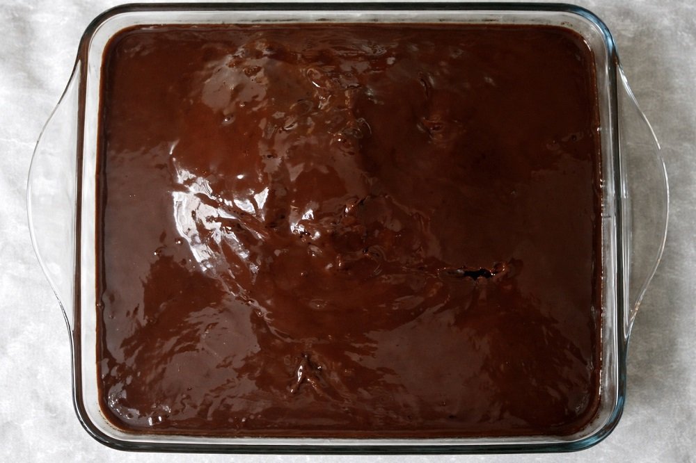 - Извадете изпечения кекс, нарежете го на порции и равномерно залейте със соса.