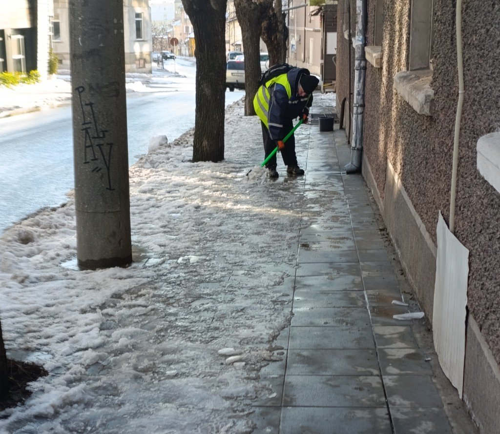 От 6:00 ч. екипите на ОП „Благоустройство и комунално стопанство“ третират с препарати и инертни материали пешеходни зони, стълбища на публични места и тротоари. Чисти се приоритетно и пред социални, здравни и образователни институции.