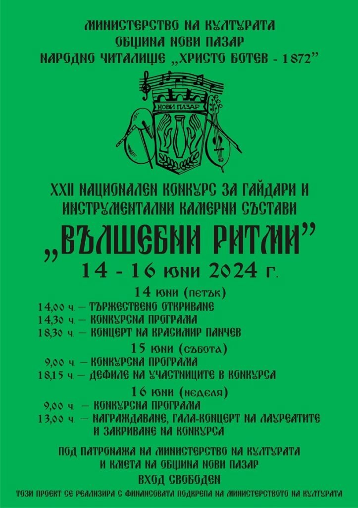 Над 150 гайдари пристигат в Нови пазар за участие в XXII Национален конкурс за гайдари и инструментални камерни състави “Вълшебни ритми” 2024. Той ще се проведе в периода 14-16 юни, а участниците в него са от Нови пазар, Шумен, Добрич, Варна, Девня, Провадия, Долни чифлик, Дулово, Плевен, Пловдив, Стара Загора, Горна Оряховица, Котел, Несебър, Бургас, Лясковец и с. Константиново.