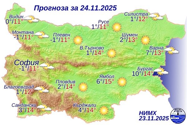 Според НИМХ и утре се очаква слънчево време в по-голямата част от страната, със слаб вятър от юг-югозапад и запазване на сравнително високите за края на ноември дневни температури.