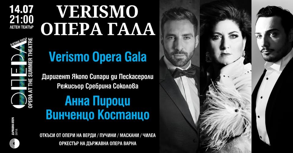 Световната оперна прима Анна Пироци триумфира в ролята на Абигайл в „Набуко“ от Верди в новата постановка на Стефано Пода, с която на 13 юни бе открит 102-рият сезон на оперния фестивал в Арена ди Верона. Избрани арии от същата партия звездната певица ще поднесе след месец и във фестивала на Държавна опера Варна Опера в Летния театър 2025. На 14 юли в Оперната гала “VERISMO” с Анна Пироци тя ще гостува за първи път във Варна със свои знакови роли от веристичния период, като Лейди Макбет, Тоска, Сестра Анджелика, Адриана Лекуврьор и др. Заедно с Анна Пироци на сцената ще излезе тенорът Винченцо Костанцо, а звездния италиански отбор ще води постоянният гост диригент на Държавна опера Варна Якопо Сипари ди Пескасероли. Режисьор на спектакъла е Сребрина Соколова.