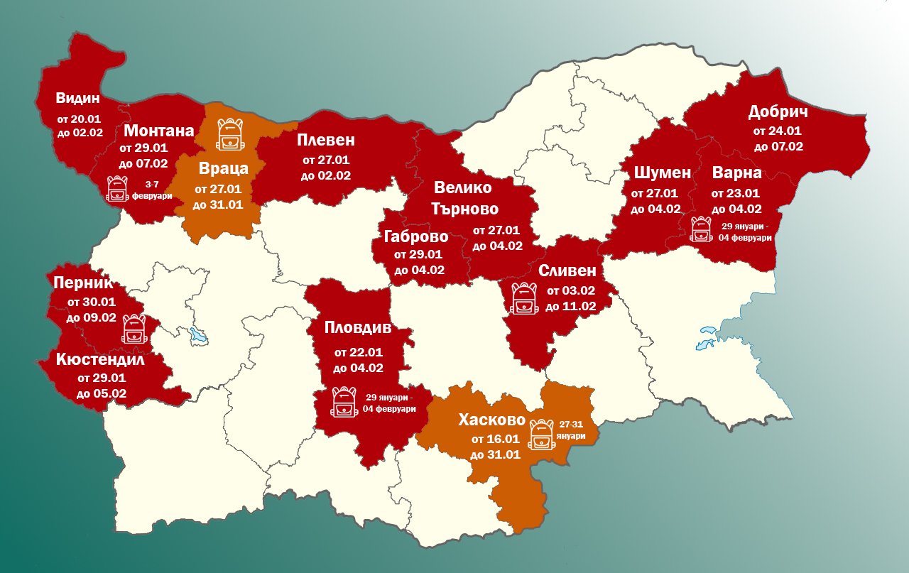 Припомняме, че учениците не са присъствено в клас и в областите Перник, Пловдив, Варна. Училищата са затворени също във Враца и Хасково до утре – 31 януари, когато ще бъде направена нова преценка дали въведените мерки ще бъдат удължени.