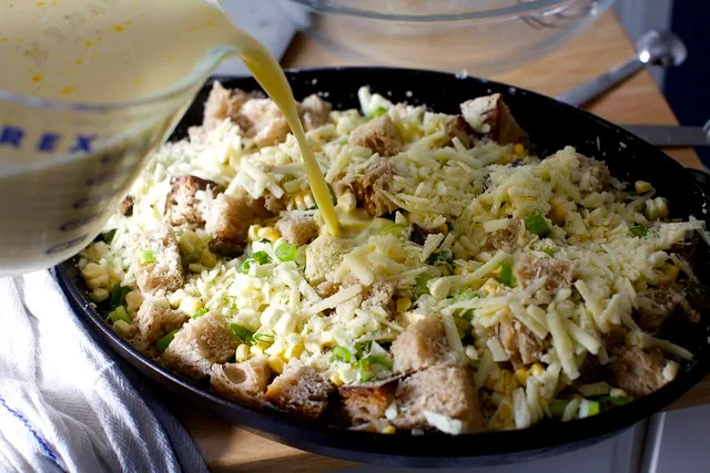 4. Подредете 1/3 от кубчетата хляб на дъното на тавата, поръсете с 1/3 от царевицата и лука, след това 1/3 от сместа със сирене. Повторете още два пъти, докато свършат продуктите.