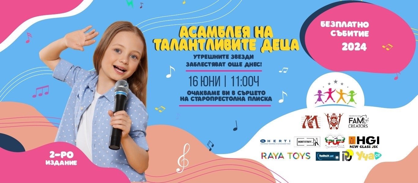 На 16 юни 2024 г. първата столица на България – Плиска ще приветства на една сцена над 200 талантливи малчугани. Поводът е второто издание на „Асамблея на талантливите деца“, организирано от Музикална школа “Моника Ла Ре Ми”, част от Националното сдружение „Клуб Плиска представя“.