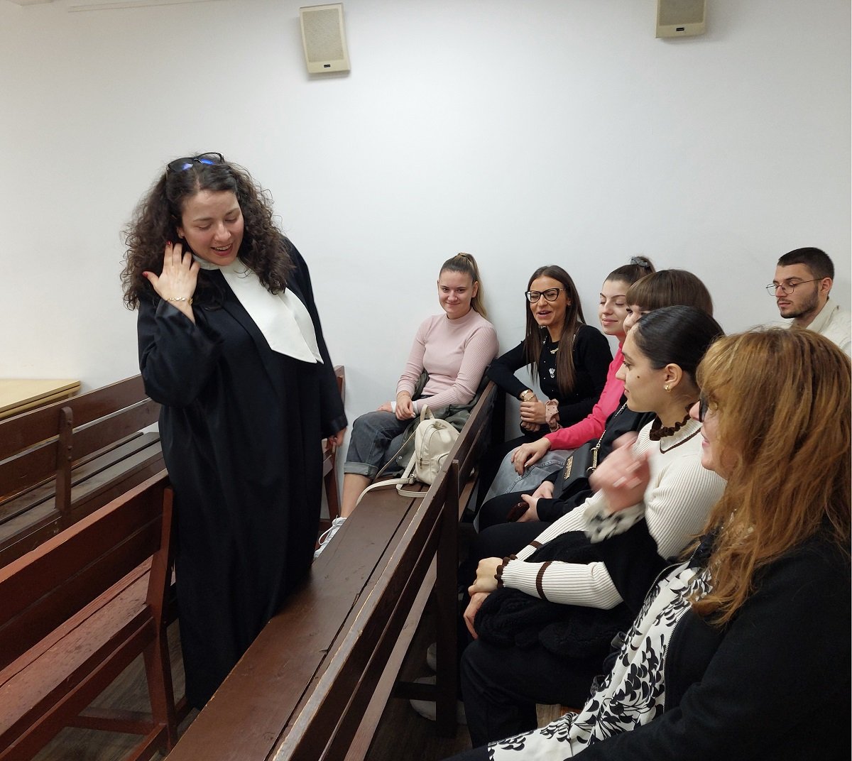 Младите хора, изучаващи дисциплината „Гражданско право и процес“, заедно със своя преподавател гл. ас. д-р Живка Матеева наблюдаваха протичането на открито заседание по гражданско дело, като непосредствено след него имаха възможност да разговарят с съдия Марина Георгиева. Те поставиха въпроси относно процедурата в първото по делото съдебно заседание, допускането на доказателствени искания на страните и начина на извършване на разпит на свидетели.