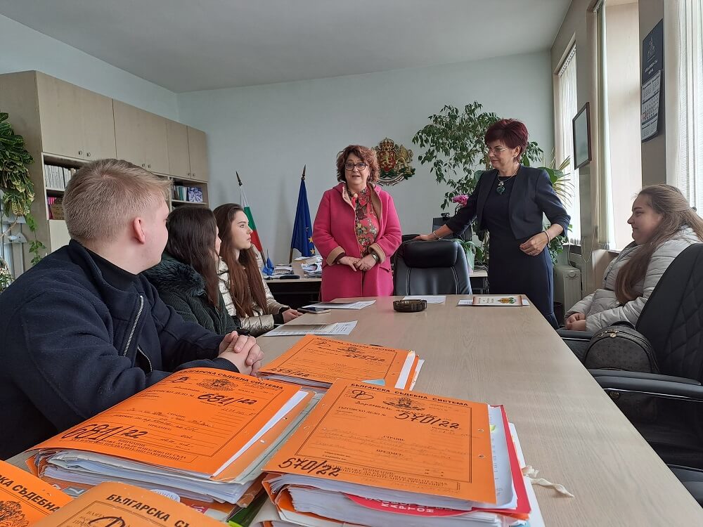 „Наистина се радвам, че сте избрали тази специалност, защото работата в съда носи огромно удовлетворение, когато се работи със сърце и любов“, насърчи младите хора ръководителят на съдебната администрация. Тя си спомни годините, в които е започнала работа в системата: „През 80-те години „зашивахме“ делата с губерки, използвахме пишещи машини, а на вас в близко бъдеще ви предстои да боравите само с електронни дела“.