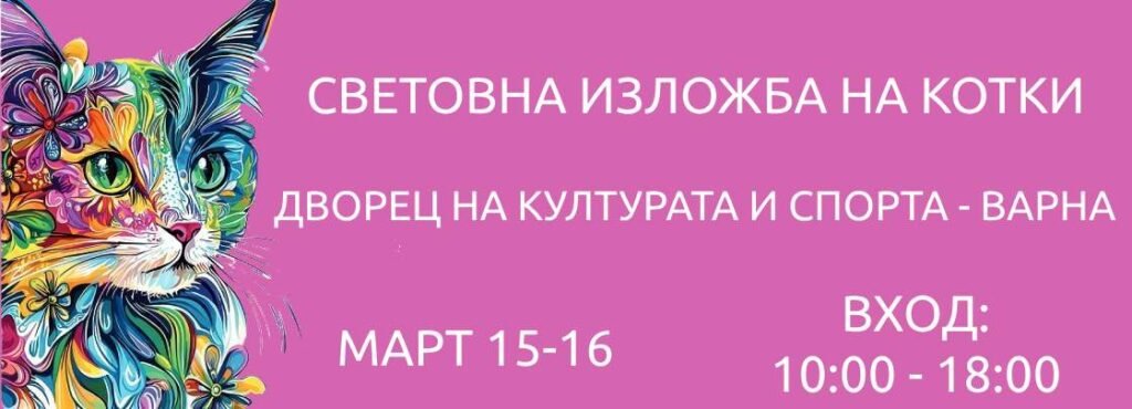 Световна изложба на котки ще се проведе на 15 и 16 март във Варна, научи TheSite24. Изложбата ще се проведе по правилата на Световната федерация на котките WCF. Изложението ще се проведе на 15 и 16 Март в Двореца на културата и спорта.