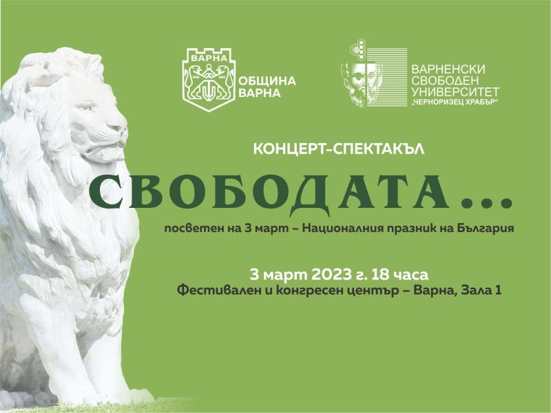 Концерт-спектакъл „Свободата…“, посветен на 145 години на Освобождението на България от турско робство, ще се проведе на 3-ти март от 18 ч. в зала 1 на Фестивалния и конгресен център във Варна. Събитието се организира от Варненски свободен университет „Черноризец Храбър“, с финансовата подкрепа на Община Варна. В програмата ще вземат участие академичният танцов театър […]