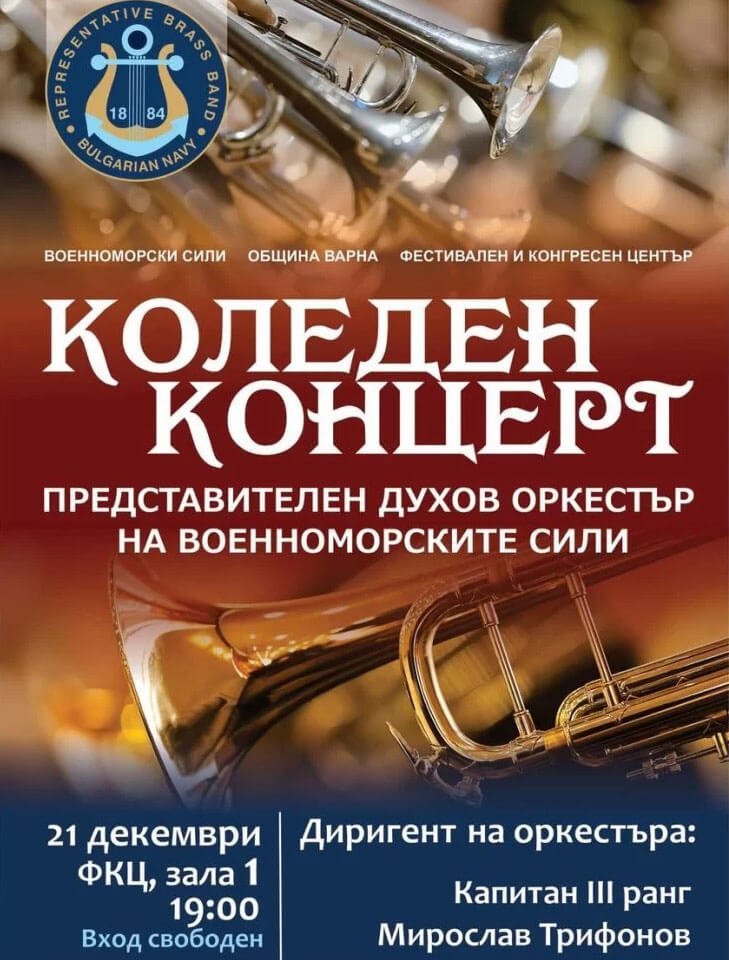 Празничен коледен концерт на Представителния духов оркестър на Военноморските сили ще се проведе днес, в зала 1 на Фестивалния и конгресен център във Варна. Под диригентството на капитан III ранг Мирослав Трифонов ще бъде представена празнична програма, в която са включени произведения на класически и съвременни автори. Концертът e с вход свободен за всички граждани […]