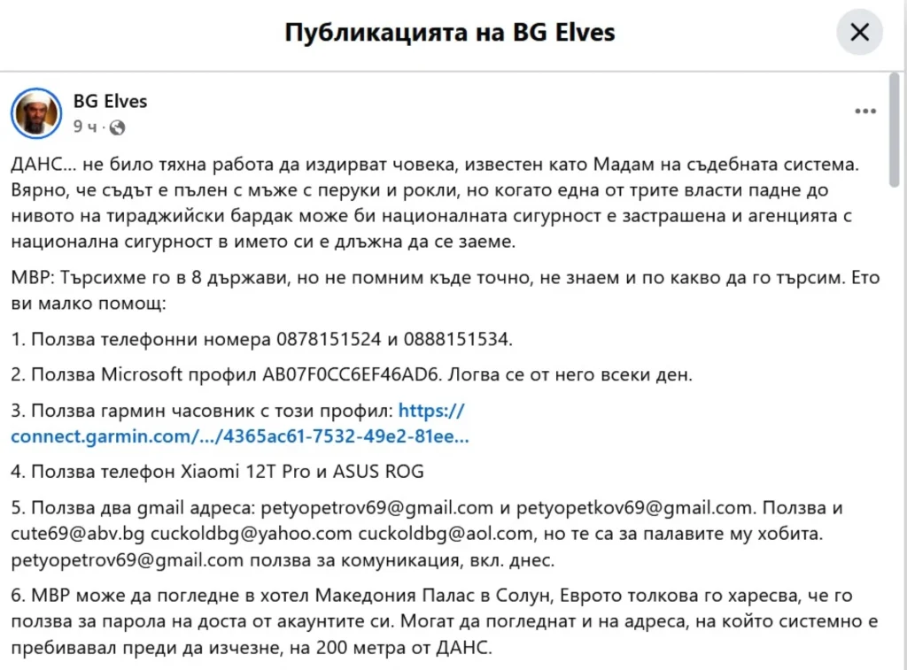 “МВР може да погледне в хотел Македония Палас в Солун, Еврото толкова го харесва, че го ползва за парола на доста от акаунтите си. Могат да погледнат и на адреса, на който системно е пребивавал преди да изчезне, на 200 метра от ДАНС”, добавят те, с уточнение: “Пепи има три самоличности, нароили се в зората на 90те, за едната се знае, че е осъждана за взломаджийство и грабежи”: Къде е Петьо Еврото? BG Elves буквално го намериха – посочиха как да бъде открит*