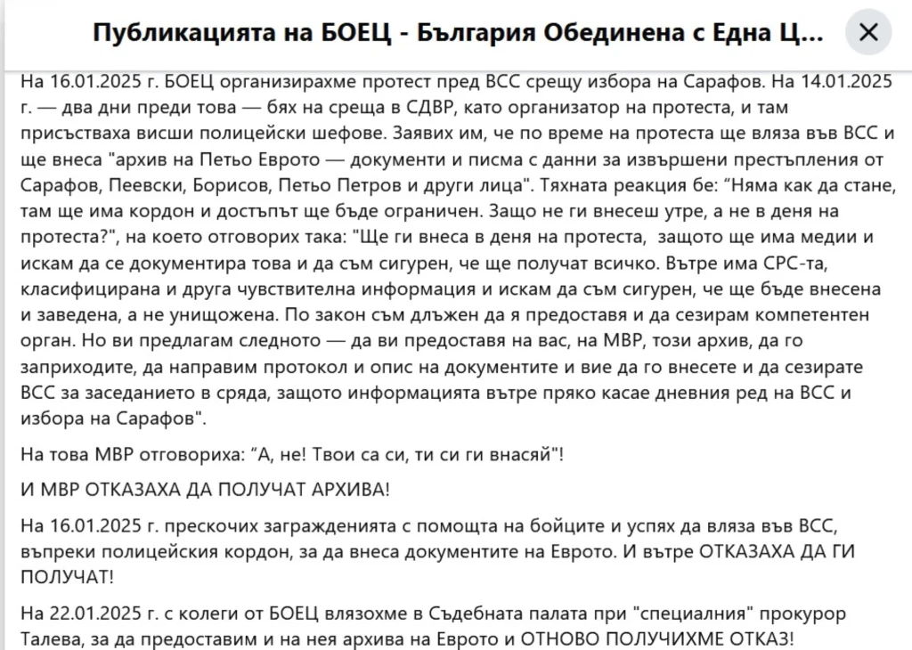 Според председателя на “БОЕЦ” Георги Георгиев обаче от МВР отказали да вземат архива на Еврото. По думите му, когато движението организирало протест на 16 януари, 2025 година, станало следното – 2 дни по-рано той бил на среща в СДВР и казал, че по време на протеста ще влезе във ВСС и ще представи “архив на Петьо Еврото — документи и писма с данни за извършени престъпления от Сарафов, Пеевски, Борисов, Петьо Петров и други лица”. От СДВР обаче казали, че нямало да стане, защото ще има кордон-охрана и предложили Георгиев да внесе това, с което разполага, ден по-рано. “Ще ги внеса в деня на протеста, защото ще има медии и искам да се документира това и да съм сигурен, че ще получат всичко. Вътре има СРС-та, класифицирана и друга чувствителна информация и искам да съм сигурен, че ще бъде внесена и заведена, а не унищожена. По закон съм длъжен да я предоставя и да сезирам компетентен орган. Но ви предлагам следното — да ви предоставя на вас, на МВР, този архив, да го заприходите, да направим протокол и опис на документите и вие да го внесете и да сезирате ВСС за заседанието в сряда, защото информацията вътре пряко касае дневния ред на ВСС и избора на Сарафов” – това твърди, че е изрекъл председателят на “БОЕЦ”. По думите на Георгиев обаче от МВР отказали.