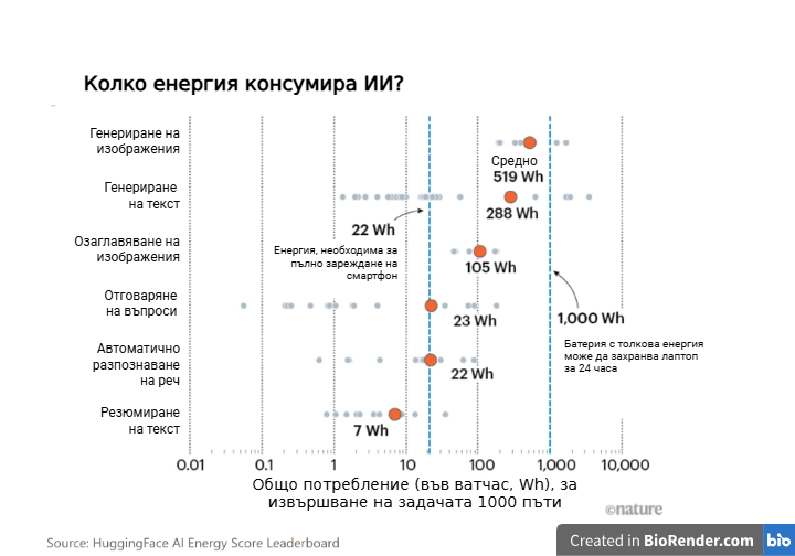 Проектът AI Energy Score оценява колко точно енергия изразходват ИИ модели при изпълнение на различни задачи. Графиката долу показва енергията, необходима за извършване на дадена задача 1000 пъти. Потреблението варира значително според задачата и използвания модел.