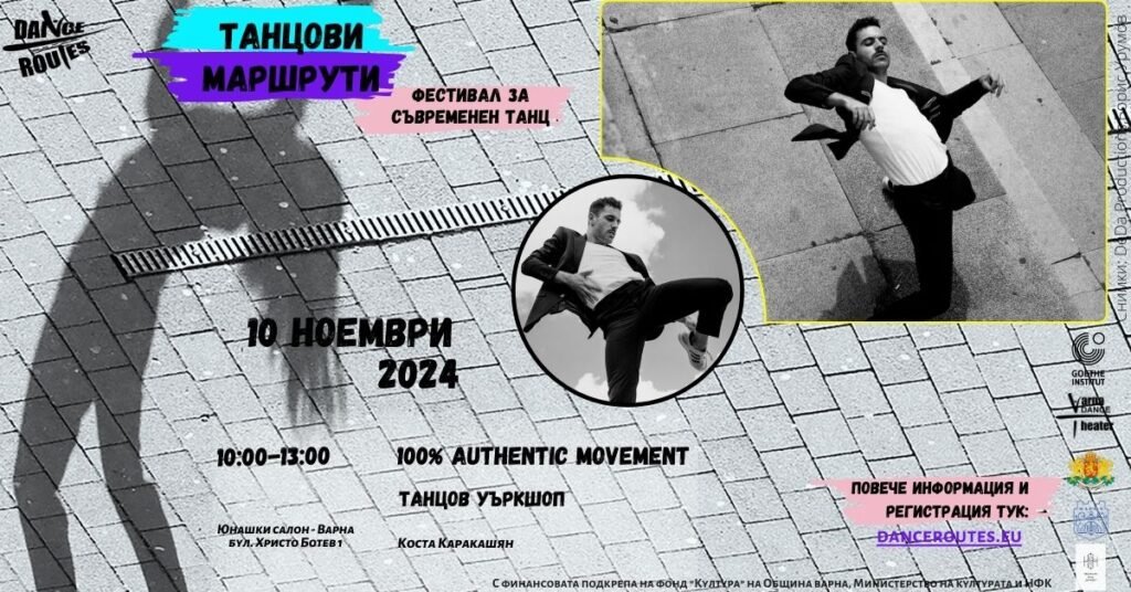 От 10:00 сутринта в Юнашки салон ще се проведе Танцов уъркшоп с Коста Каракашян – 100% Authentic Movement. Ако сте си задавали въпросите: “Как да танцувам без притеснение? Как да пресъздам с тялото си всички емоции, които чувам или усещам? Как да се подготвям така, че дам всичко от себе си на сцената?”, това е събитие за вас. Уъркшопът ще се състои от задачи за импровизация, дискусия и работа в група и записване на финално видео, като всеки участник ще получи индивидуална обратна връзка от хореографа. Събитието е подходящо за участници с всякакъв предишен опит и танцов стил.