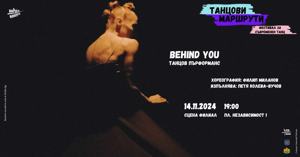 Финалният артистичен акт на „Танцови маршрути” тази година ще бъде поставен на 14 ноември от 19:00ч. на Сцена Филиал с танцовия пърформанс BEHIND YOU. Това е солов танцов пърформанс за връзката между съзнателните и безсъзнателните ни опити. Спомените се сливат и разделят, търсейки пътя си към съзнанието. Пърформансът е по идея и хореография на Филип Миланов в изпълнение на Петя Колева-Вучов.