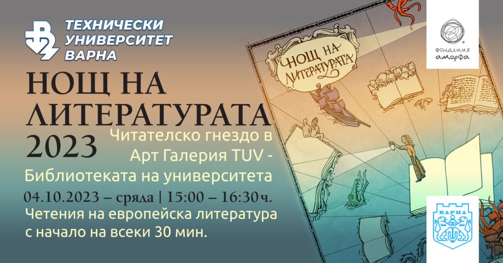 На 4 октомври 2023 г. от 15:00 до 16:30 часа в Арт Галерия TUV, пред Библиотеката на Технически университет – Варна, ще се проведе Малка Нощ на литературата. На събитието ще бъдат представени три нови текста от селекцията на Нощта на литературата за 2023 г., които представят литературите на Австрия, Украйна и Финландия. На всеки 30 минути в читателското гнездо ще се чете един и същ откъс от следните книги: