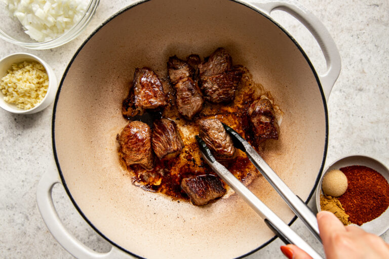 2. Запечатване на месото: В дълбок тиган или тенджера с капак загрейте олиото на силен огън. Овкусете месото със сол и го запечатайте от всички страни до кафява коричка. Работете на партиди, за да не се задуши. Прехвърлете месото в бавноготвач (slow cooker).