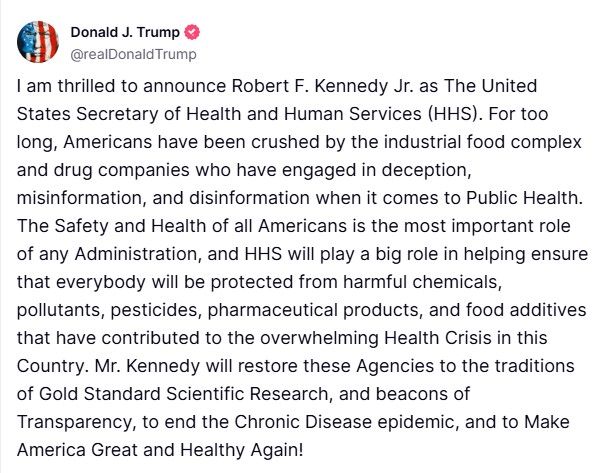 В публикация в социалната мрежа X, Кенеди обеща да работи за прекратяване на хроничните заболявания, изчистване на корупцията и предоставяне на американците на данните, от които се нуждаят, за да вземат информирани решения, обещавайки на Тръмп, че ще работи, за да „направи Америка отново здрава“, съобщава Reuters.