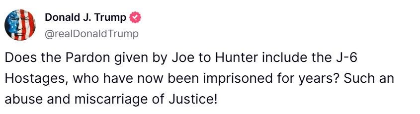 „Помилването, дадено на Джо Хънтър, включва ли „заложниците“ от 6 януари, които са били в затвора от няколко години? Такава злоупотреба и нарушение на правосъдието!“ – написа Тръмп на страницата си в социалната мрежа Truth Social.