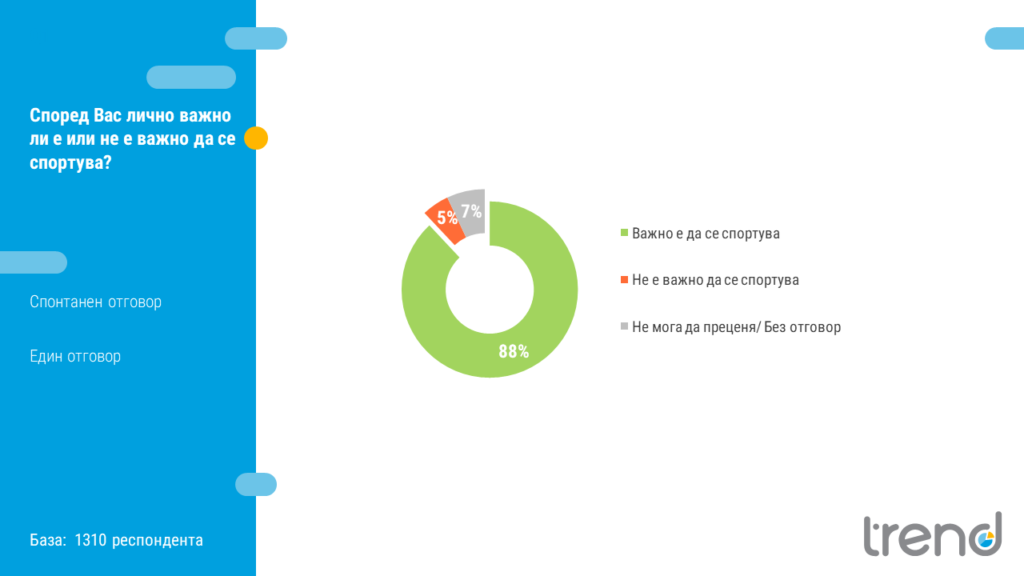 Почти консенсусно (88%) българите споделят мнението, че е важно да се спортува. Само 5% са на обратното мнение. Данните от тези твърдения ясно показват, че в българското общество съществува концепцията за положителните страни на спорта, което е добра основа за мотивирането на повече хора да спортуват.