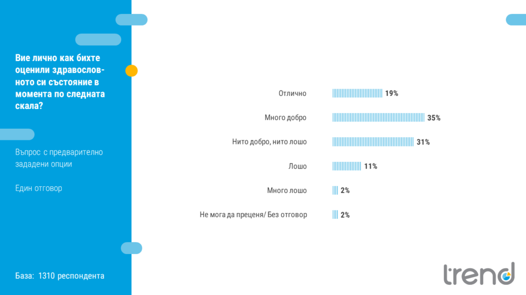 Над половината от българите оценяват здравословното си състояние като отлично (19%) или много добро (35%), докато 11% като лошо. Съвсем закономерно, здравословното състояние е пряка функция на възрастта – над две трети от тези над 60 години оценяват здравния си статус като лош или много лош.
