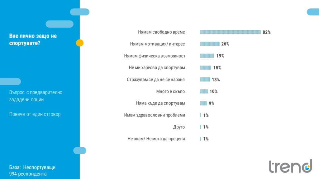 Сред тези, които не спортуват, основен аргумент е, че нямат свободно време. В пъти по-ниски дялове регистрираме в отговори като „нямам мотивация / интерес“ или „нямам физическа възможност“, които са на второ и трето място като дял посочили.