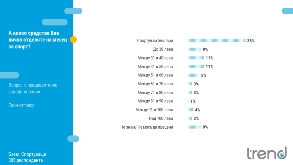 По отношение на тези, които плащат, за да спортуват, бюджетът, който отделят в най-големи дялове е между 31 и 50 лева месечно. Ниски дялове се отчитат при суми над 60 лева.