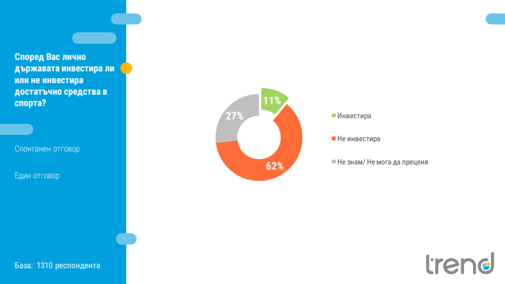 Само 11% от всички интервюирани са на мнение, че държавата инвестира достатъчно средства в спорт. 62% са на обратното мнение. 83% споделят, че държавата трябва да инвестира повече в спорта, а 87% да се инвестира повече в поддръжка на спортна инфраструктура. Близо три четвърти от всички българи над 15 години смятат, че физическата активност на българите трябва да бъде приоритет на държавата.