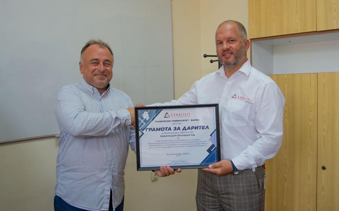 Технически университет – Варна получи ценна подкрепа на 26 септември 2024 г. от „Цератицит България“ АД – Габрово, водеща компания в областта на прецизните режещи инструменти и технологии. Фирмата направи значително дарение, включващо 68 компютърни конфигурации, предназначени за катедра „Технология на машиностроенето и металорежещи машини“, които ще подпомогнат обучението на студентите от специалност „Компютъризирани технологии в машиностроенето“.