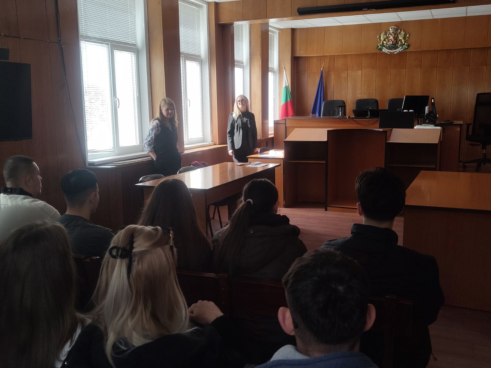 Гостите първо бяха запознати с правилата за вътрешния ред, изискванията за облекло и пропускателния режим в съдебната сграда, а след това и със структурирането на всяко едно съдебно заседание – къде се позиционират всички страни в процеса и как протича едно съдебно заседание. Прокурор Енева нагледно показа и как изглежда червената тога – задължителното облекло за всеки прокурор в съдебната зала.
