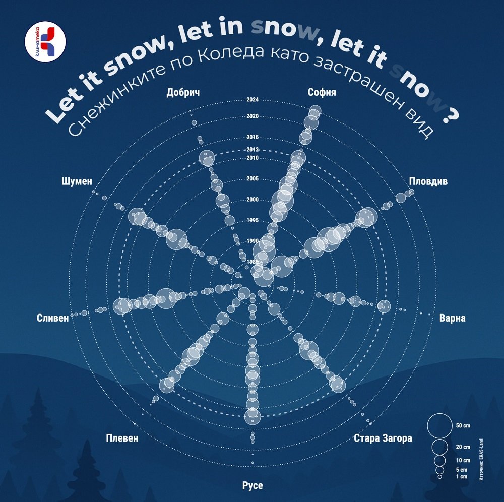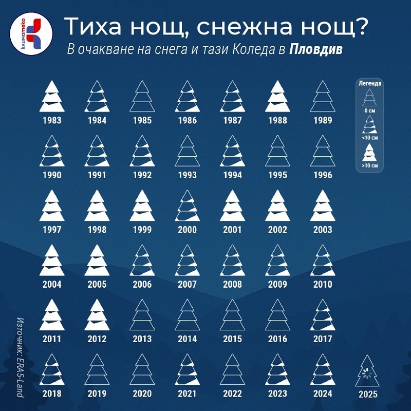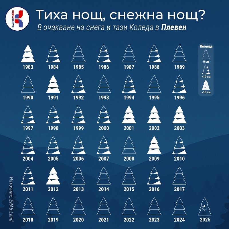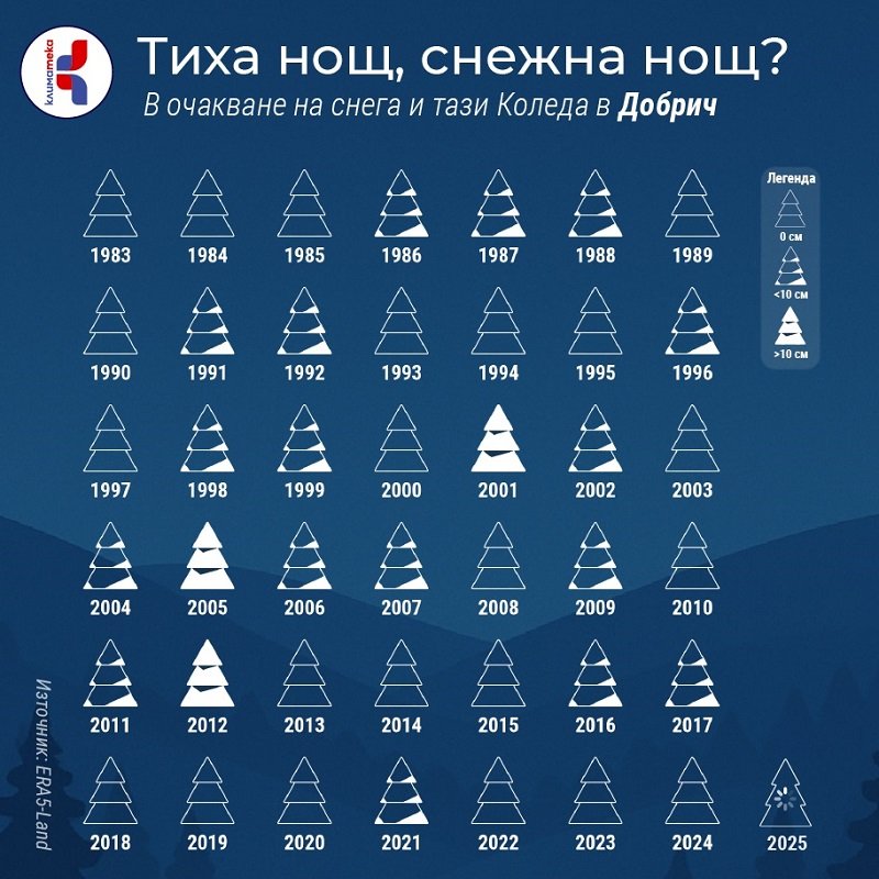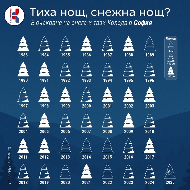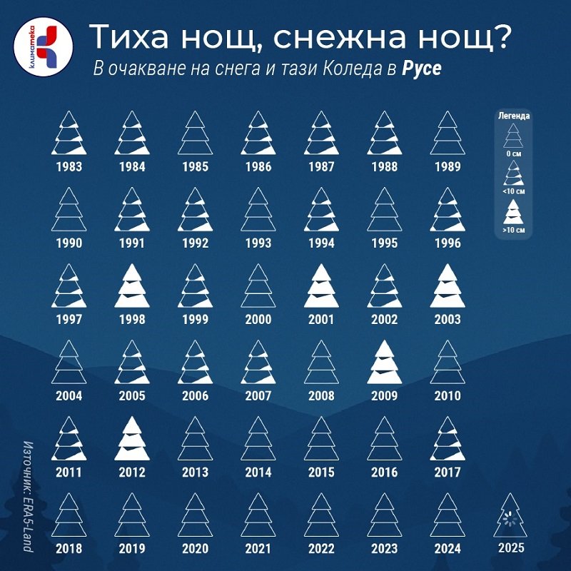 Данните за последните 42 години показват, че след 2012 г. в редица големи български градове снежната Коледа се среща все по-рядко. Това е картина, която не описва климата през цялата зима, но е показателна за тенденцията на свиване на снежните дни у нас и ни кара да се замислим за бъдещето — дали децата ни ще преживяват бялата Коледа такава, каквато я помним ние?
