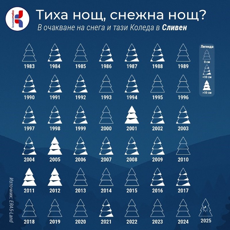 В град Сливен ситуацията е малко по-оптимистична, тъй като през последното десетилетие натрупал сняг е имало през 3 години – 2016, 2017 и 2021 г. Но и там безснежните години вече са значително по-чести. Преди е имало снежна покривка в ¾ от Коледите, като понякога тя може и да е над 10 см. След 2012 г. имаме обратното правило – тънък сняг има едва през ¼ от времето.