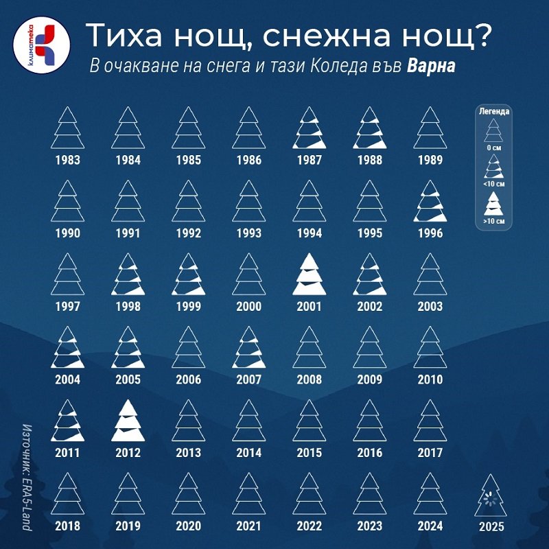 Снежната Коледа се оказва не просто празничен символ, а чувствителен индикатор за промените в климата. Данните ясно показват, че след 2012 г. зимите в България – включително и във Варна – стават по-меки, снежните дни намаляват, а снегът все по-често остава в спомените от миналото.