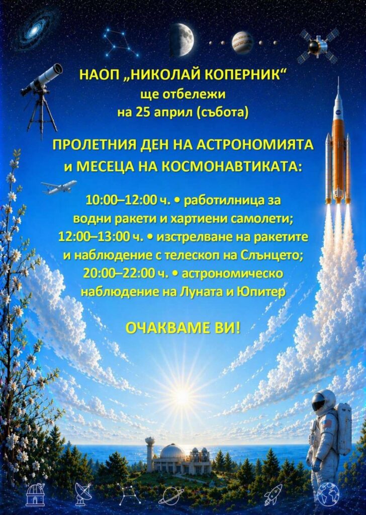 На 25 април (събота) НАОП „Николай Коперник“ ще отбележи Пролетния ден на астрономията и Месеца на космонавтиката с богата програма за посетители.