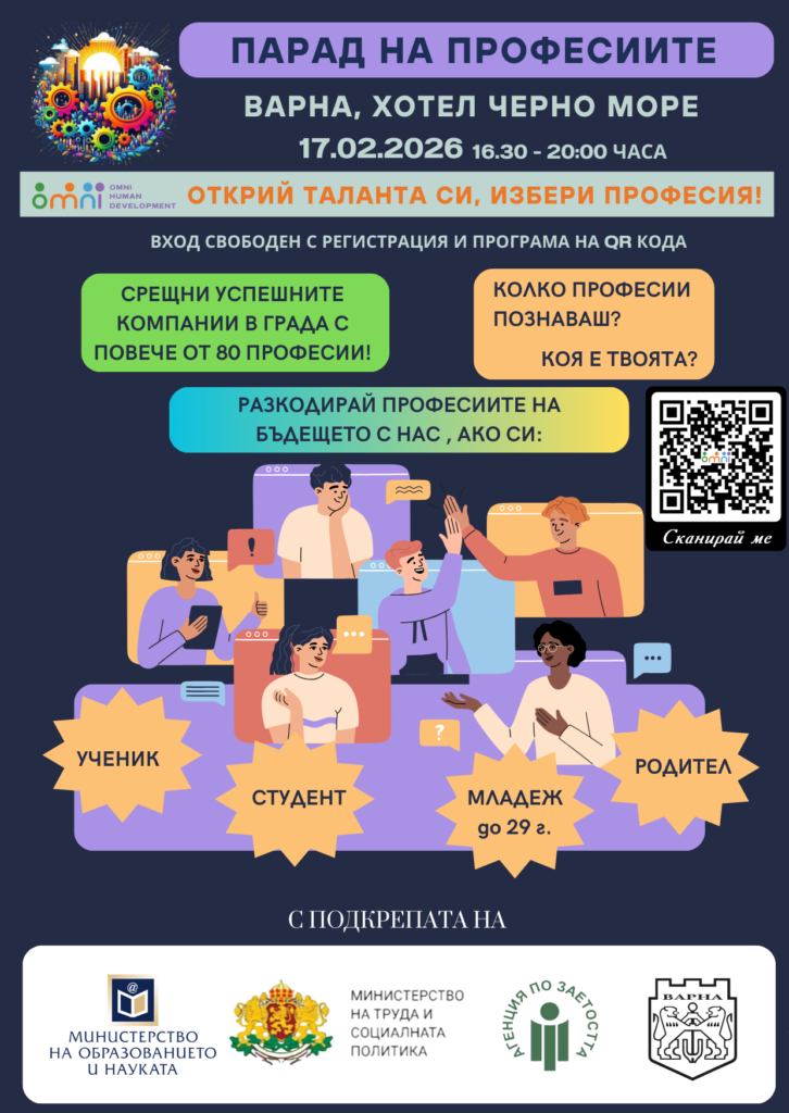 „Парад на професиите: Открий таланта си, избери професия“ ще се проведе 17 февруари 2026 г. от 16:30 до 20:00 ч. в хотел „Черно Море“. Присъединете се към форума с безплатна регистрация на: https://forms.gle/aBo4mdGh8KZunsX68