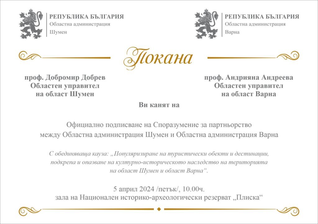Днес в 10.00ч. в залата на музея в Националния историко-археологически резерват „Плиска“, областните управители на Варна и Шумен – проф. Андрияна Андреева и проф. Добромир Добрев ще подпишат споразумение за партньорство между двете администрации. Каузата, която обединява двете институции е „Популяризиране на туристически обекти и дестинации, подкрепа и опазване на културно-историческото наследство на територията на областите Шумен и Варна“.
