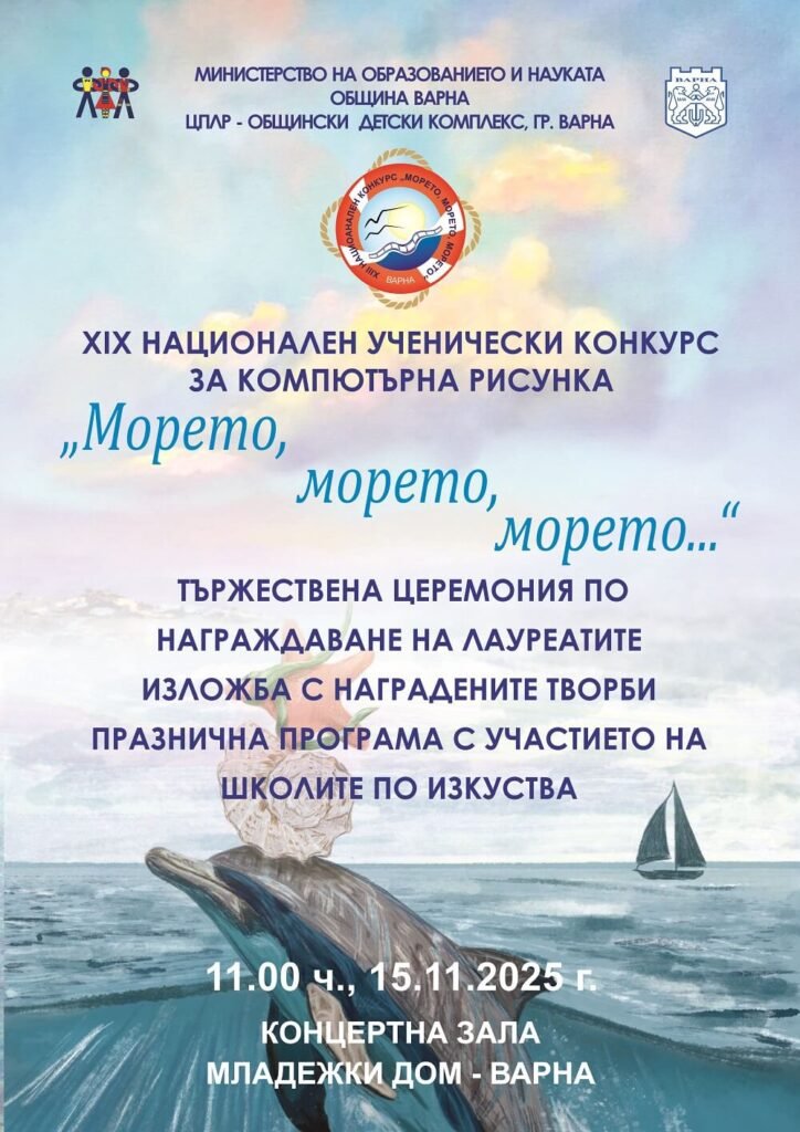 До 2 ноември т.г. е срокът, в който може да се запишете за участие в XX Национален конкурс за компютърна рисунка “Морето, морето, морето…”, организиран от Министерството на образованието и науката, Община Варна и ЦПЛР – Общински детски комплекс, гр. Варна. Участниците в конкурса са разпределени в три възрастови групи: І – ІV клас; V- VІІ клас и VIII – XІІ клас. Всеки участник задължително трябва се регистрира във формата, публикувана в официалната уеб страница на ЦПЛР – Общински детски комплекс, гр. Варна. Творбите също се изпращат по електронен път. Рисунките се изработват в програма по избор. Трябва да бъдат в размер A4, файлов формат JPG, JPEG, PNG, GIF, SVG. Файлът не трябва да е по-голям от 1 Мбайт (1 048 576 байта).
