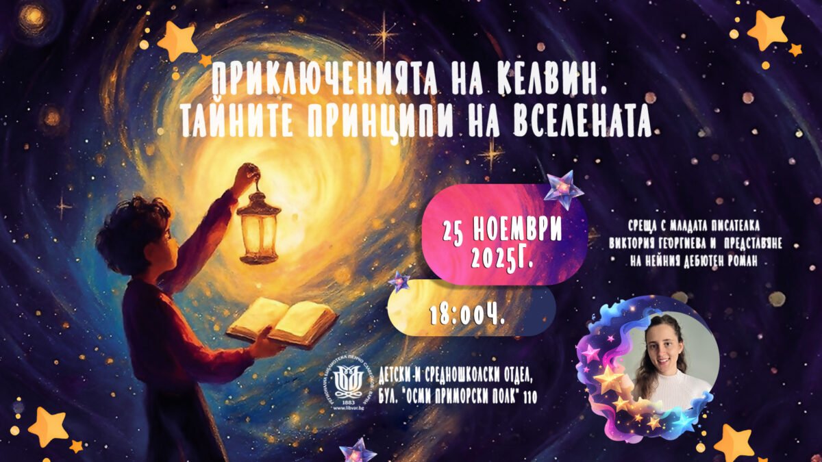 Културната програма продължава на 25 ноември от 18:00 ч. с дебюта на младата писателка Виктория Георгиева. Младежкият роман „Приключенията на Келвин. Тайните принципи на Вселената” от 23-годишната варненска авторка ще бъде представен в отдел „Детски и средношколски“, където читателите ще се потопят в свят на магия, мистерии и откривателство.