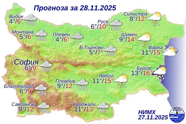 За 28 ноември 2025 г. НИМХ издава предупреждение за значителни валежи в 20 области от Западна и Централна България. В областите: Благоевград, Смолян и Кърджали предупреждението е от трета степен (червен код), от втора степен (оранжев код) в 8 области, а за 9 области предупреждението е от първа степен (жълт код).