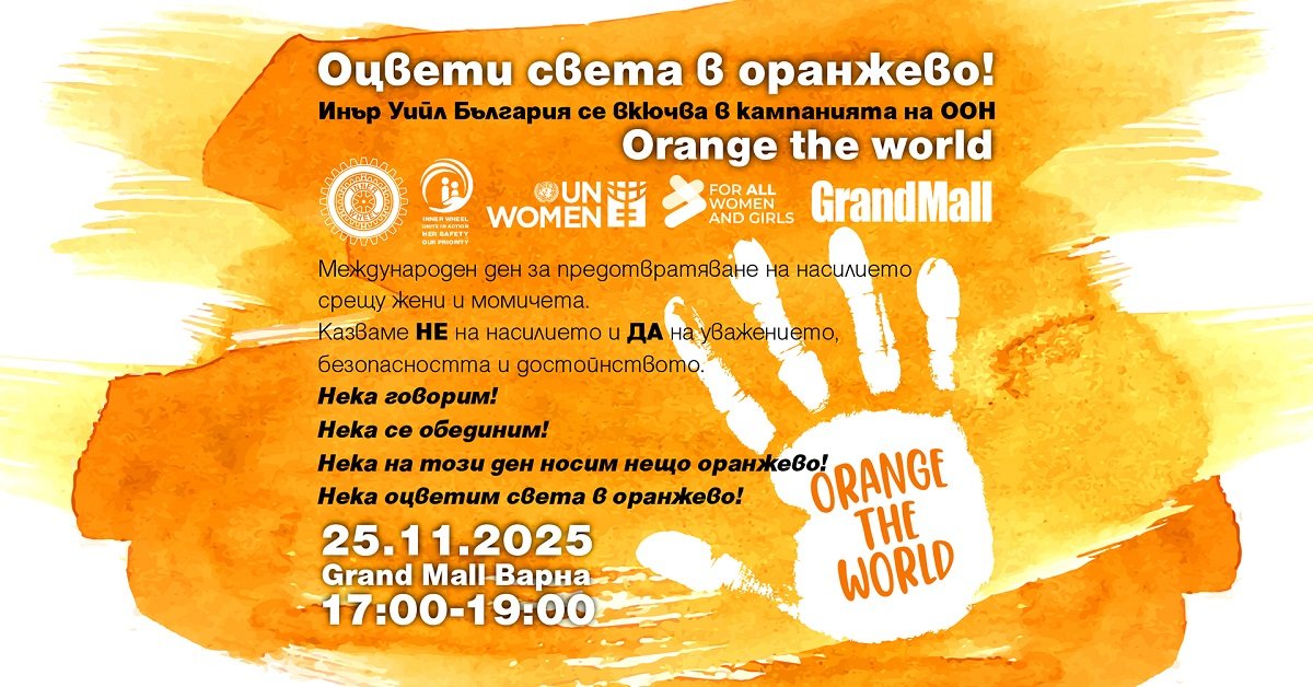 На 25.11.2025г в град Варна, членовете на Интернешънъл Инър Уийл от 3-те клуба – ИУ клуб Варна, ИУ клуб Варна-Марина и ИУ клуб Варна Еуропея в партньорство с Гранд Мол – Варна от 17:00ч. до 19:00ч. ще проведе кампания “Orange the world”. Кампанията е изцяло информативна. На всички посетители ще бъде предоставена информация за формите на насилие, как да се разпознават застрашените или подложени на насилие жени , къде могат да се обърнат за помощ. Информацията ще бъде предоставена чрез раздаване на стикери, книгоразделители, балони и други материали. Тъй като символ на кампанията е Оранжева ръка, на която е изписано – Спри насилието (Stop the violence), ще се раздават и оранжеви домакински ръкавици с мотото Clean the violence : Изчистете насилието от дома си, училището, работното място.