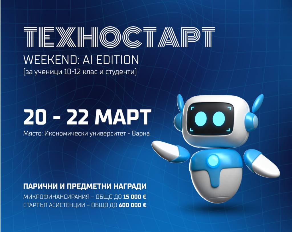 В периода 20–22 март 2026 г. в Икономически университет – Варна ще се проведе ТЕХНОСТАРТ Weekend: AI Edition – стартъп хакатон за ученици и студенти, посветен на разработването на AI-базирани решения по реални бизнес и обществени предизвикателства. Събитието предлага интензивен формат с елементи на акселератор, в който участниците ще работят в екипи, ще развиват иновативни идеи и ще представят проектите си пред жури от представители на бизнеса и технологичния сектор.